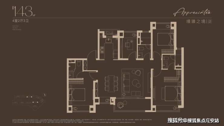 建面约143㎡四房设计,不论是三代同堂还是二娃家庭,都舒居无忧!2梯2户的设计, 极具私密性的入户门厅,彰显大宅归家礼序 。独立玄关,既是归家仪式感,更添收纳空间;约14米朝南面宽,搭配约7米尺度横厅,尽显大宅风范; 东西双套房设计,奢享全龄世家的静谧时光。