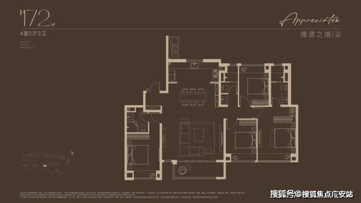 建面约172㎡4房户型,多娃家庭的进阶之选!奢阔尺度尽显家族气度!2梯2户, 子母双开门礼序入户,私密尊崇门厅;约16米四开间朝南,搭配约6米尺度横厅,揽四时风景入怀。