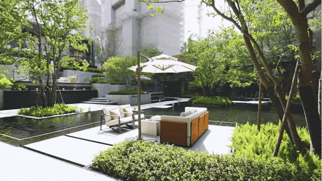 走进来,便是满眼绿意的下沉式景观庭院,拾级而上,两侧景观在阳光的照耀下呈现出非凡的光影,还有潺潺流水相伴,带来度假式的沉浸体验。