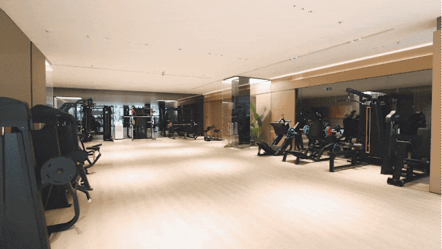 在下沉式景观庭院两侧,是不同的邻里空间。一侧是社区邻里中心,涵盖恒温泳池以及宽阔的健身房空间。当业主锻炼时,不被空间局限。透过落地窗,可以一边挥洒汗水,一边尽情欣赏庭院中的美景。