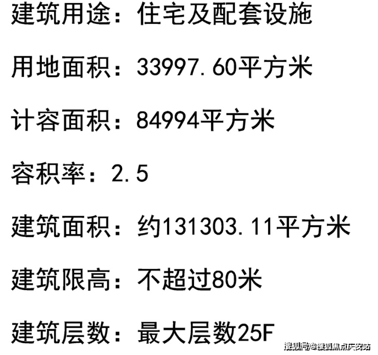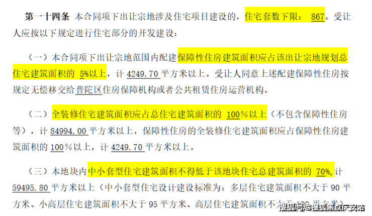 地块用地性质为普通商品房,容积率约2.5,限高80米,住宅套数下限867套,需配建5%以上保障性住房,中小套户型不得低于70%,全装修比例100%!