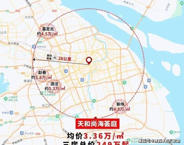 项目直线距离人民广场约28公里,我们以相同半径画圈,同一纬度的圆周板块,新房价格普遍超过5万/㎡