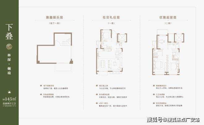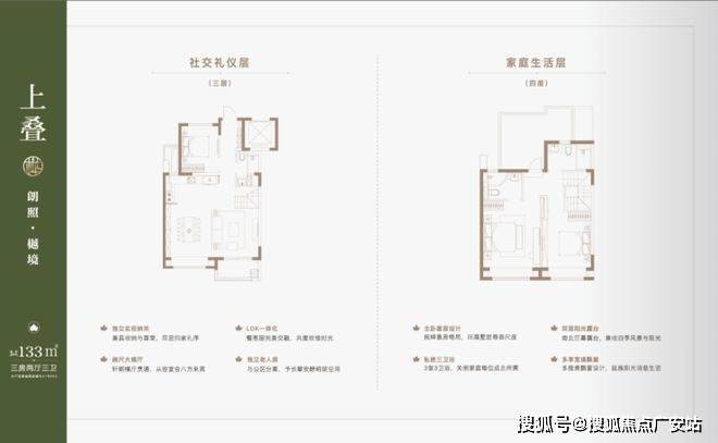 叠墅产品分为4F、6F层叠加, 主力产品建面约约122-133㎡上叠,132㎡大平层,131-145㎡下叠。