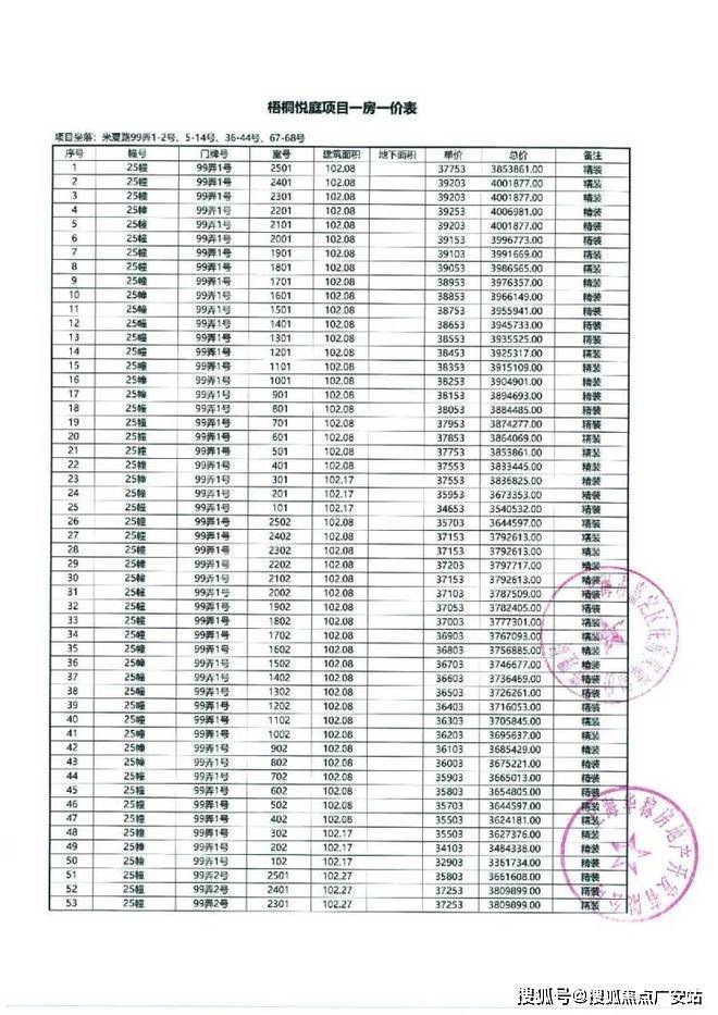 以下为项目最新一房一价表