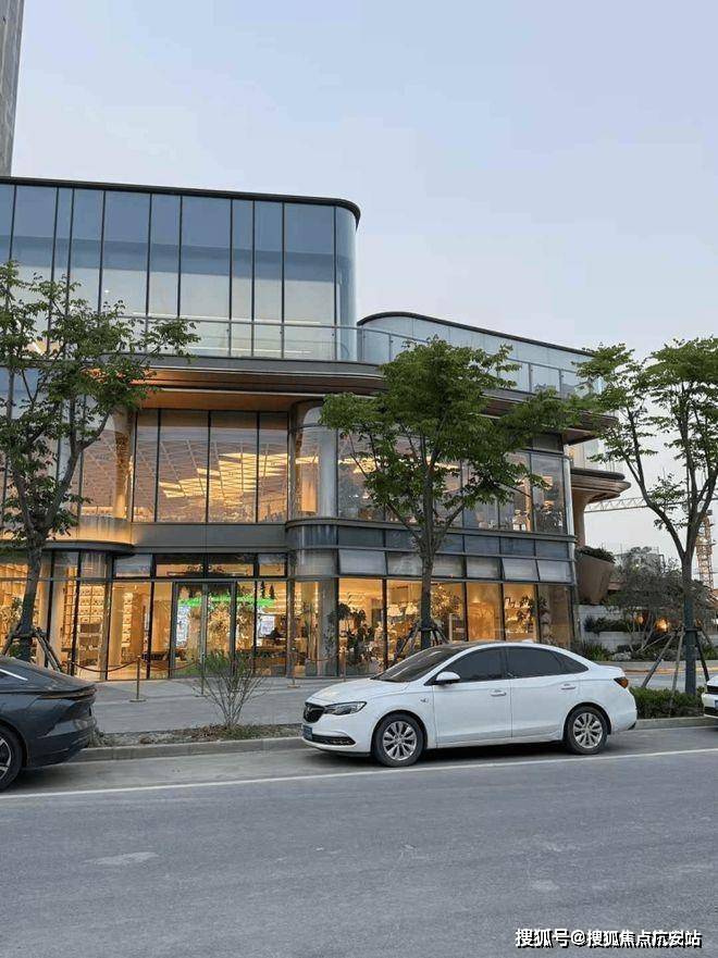 设计理念:自然融入生活:整体采用现代简约风格,搭配大面积落地玻璃,将室外的绿植景观引入室内,阳光透过玻璃洒在浅色调的接待区,既通透又显温馨;售楼处外还打造了约800㎡的景观庭院,设有休闲座椅和四季绿植,到访客户可在庭院中漫步,提前感受社区的居住氛围。
