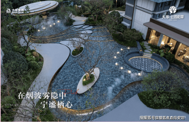 首先,大华公园柏翠利用12级叠水、2座树池、9步水上汀步,运用六重造景的手法打造近500平的中央水景!