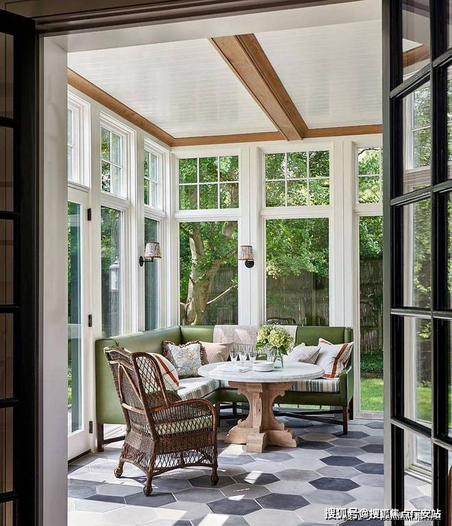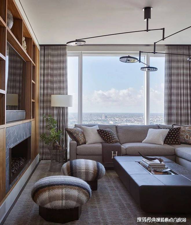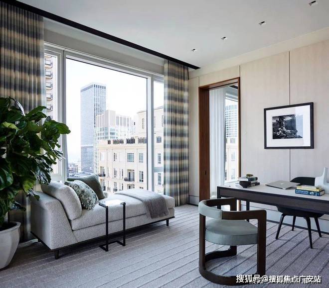 百分之百的优雅对材质的要求异常严格,而胡桃木的材质恰好强调了空间的高级感,利用老式La Verne茶几、Kelly Wearstler的椅子和Fort Street Studio的地毯让人仿佛穿越回五十年代的复古时空。