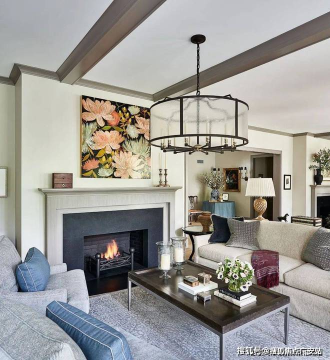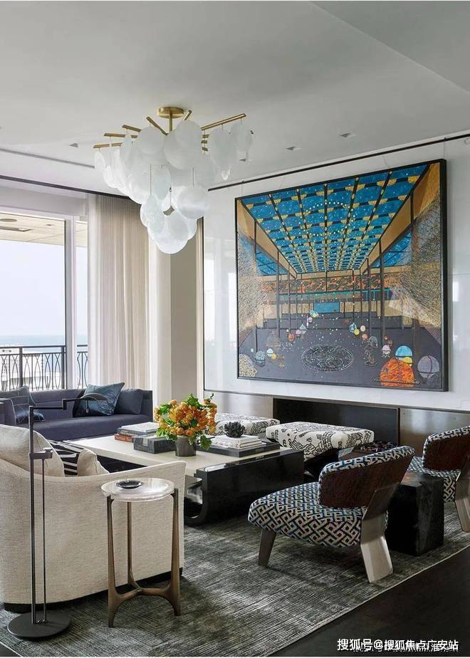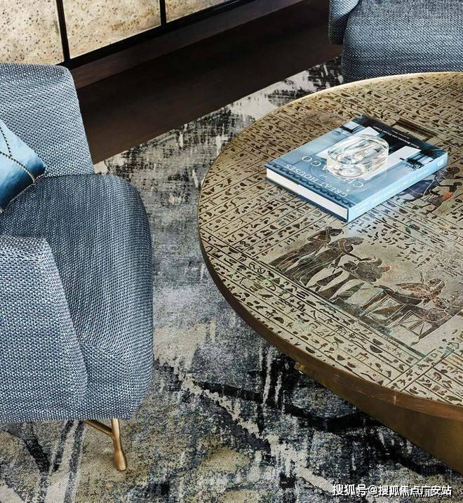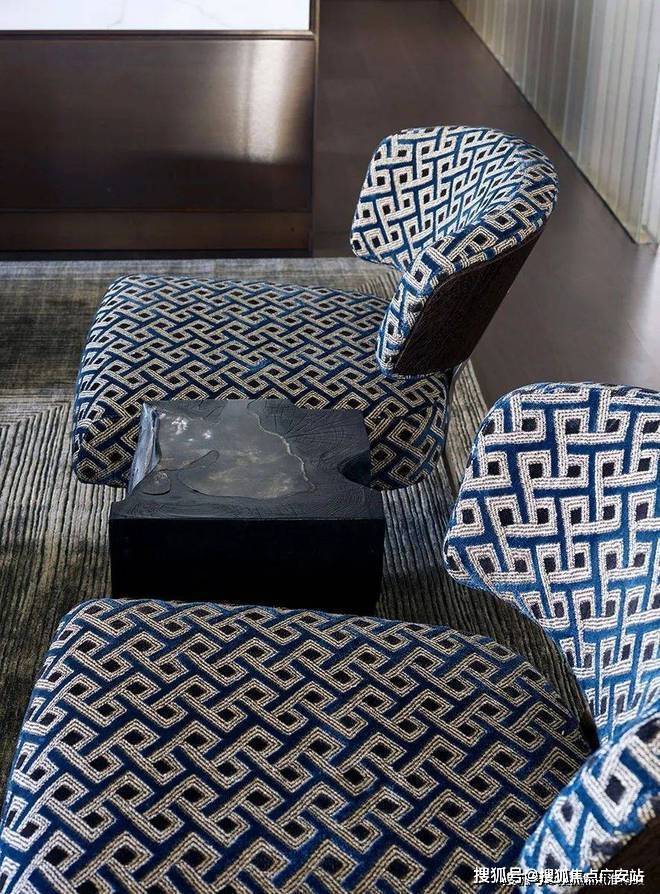 从客厅开始,整个空间都遍布着蓝色的元素,设计师以星座为主题进行设计,搭配上James Thomas的茶几、Holly Hunt的沙发、Minotti的扶手椅和Andrianna Shamaris的边桌,打造既高级又充满梦幻感的居家空间。