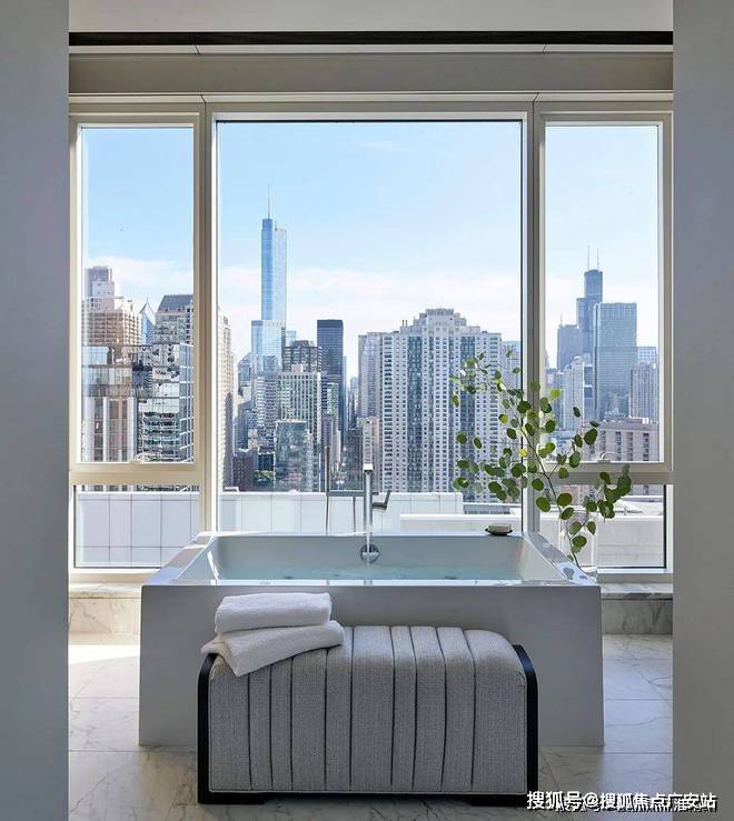 就连浴室也确保了极好的视野,大玻璃窗的设计让整个空间的光线感十足。