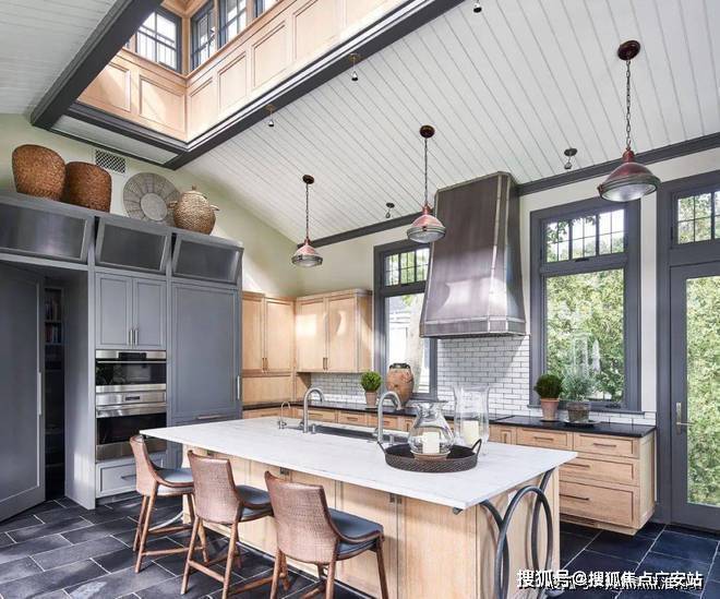 富有纹理的橡木橱柜散发着乡村气息,厨房岛上方的天窗充满了饱和的阳光,屋顶的吊灯灵感来源于工业美学,增强了工作厨房的既视感。