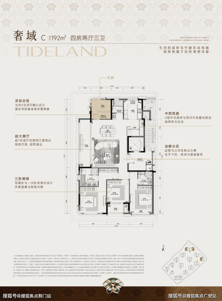 再看192方户型,更注重空间的包容性与场景多元。客餐厅一体化设计达到约49方,配合中西双厨配置,满足家庭聚会与社交宴会的需求。双套房设计增强了家庭成员间的居住私密性,而书房的270°采光面则极大提升了使用的舒适度与通透感。