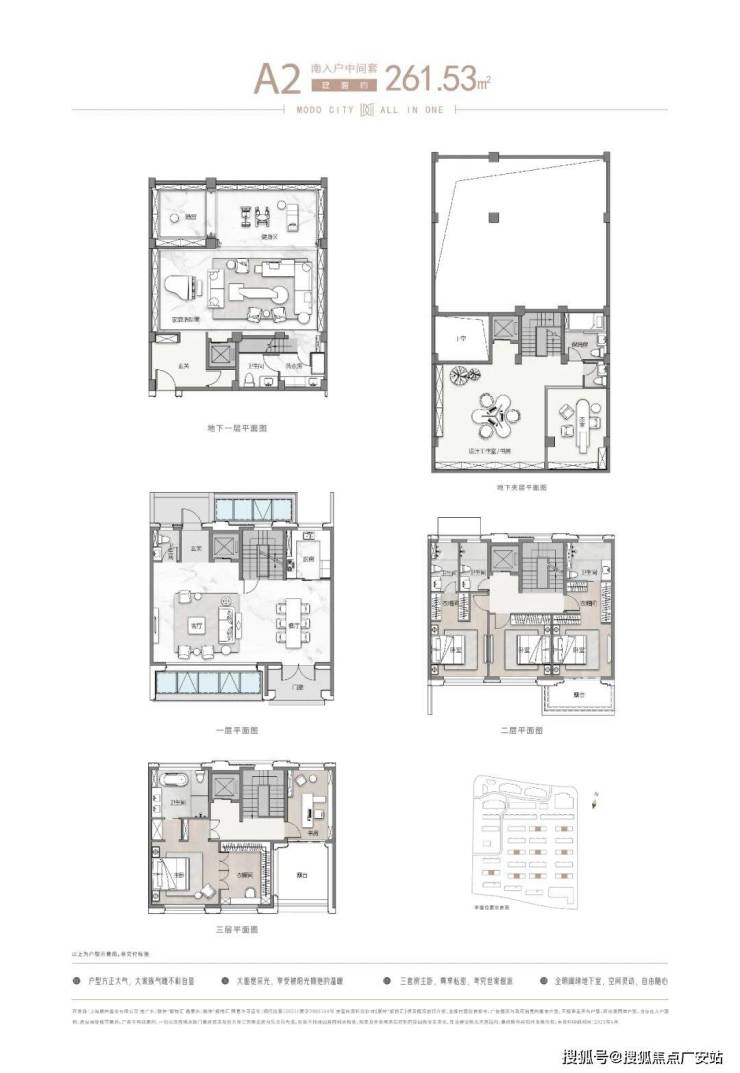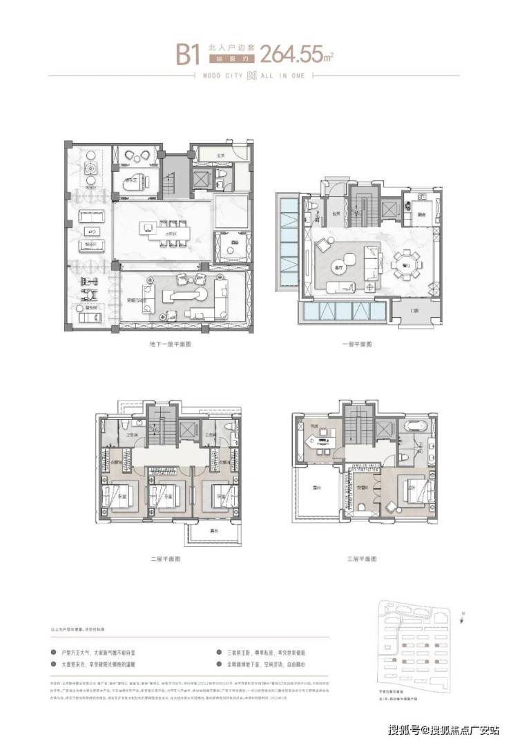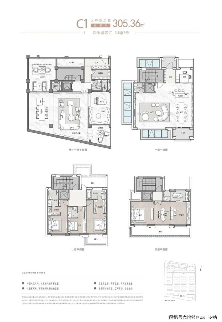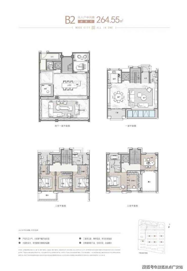 项目主推建面约262-305㎡联排别墅,分为南北入户,均为地上三层,地下两层设计,满足业主们“有天有地有花园”的别墅居住体验!