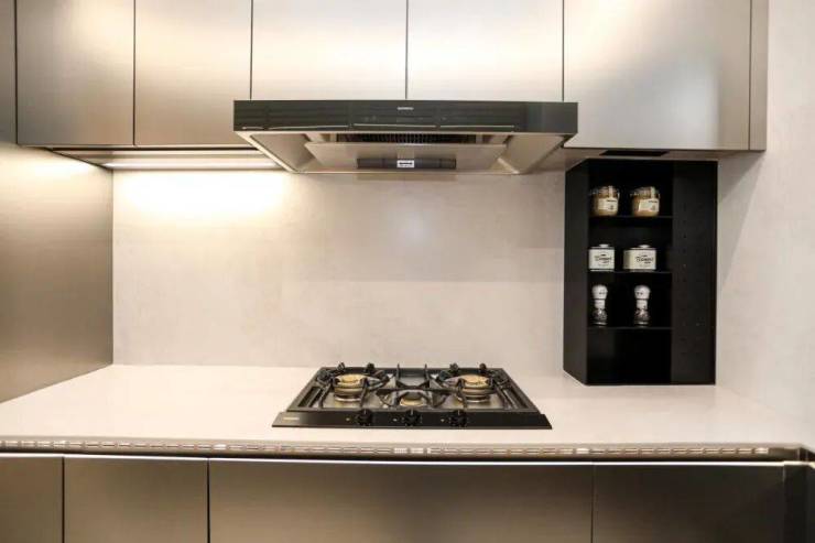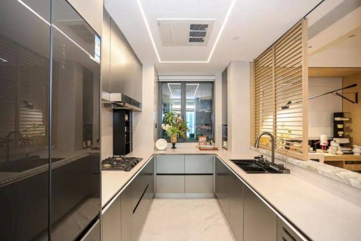 厨房精选国际一线豪宅同配厨电九件套,集成嘉格纳油烟机、灶具;博世嵌入式冰箱、洗碗机、保温碟抽、嵌饮机、蒸烤机;日立厨房专用空调;A.O.史密斯热水器等。
