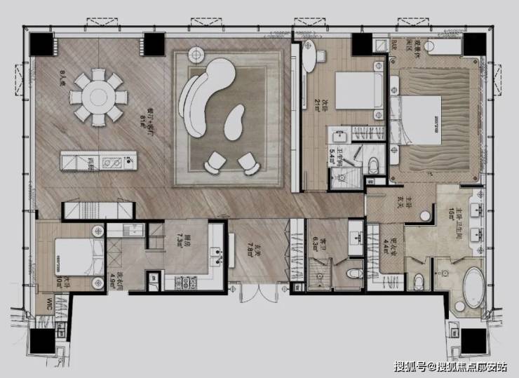 诚邀知名设计师戴鹏原创奢阔大平层空间,在限量席位的空间规划中,将生活形态和美学意识转换为尊贵身份的注解。