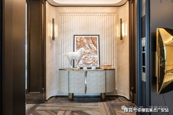例如入户玄关铺设有“石材皇后”鱼肚印象,这种级别的奢石在很多顶豪项目中通常仅作局部镶嵌
