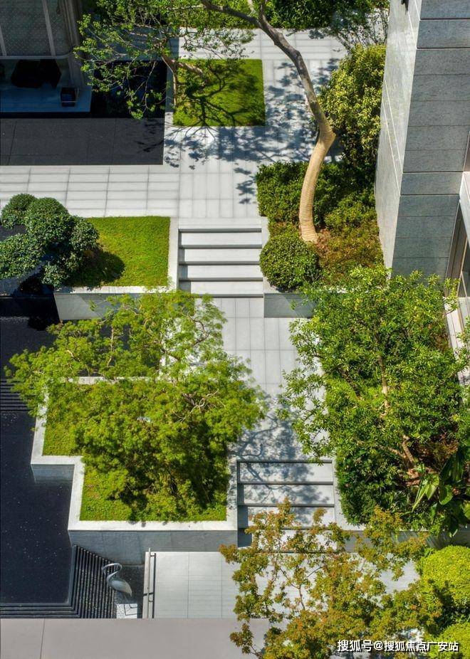 有背山必须傍水,从小区正门的独立高端会所进入园区后,之江壹品特意作了退进式梯度入口,中心引入意式跌水水景;从两侧围着水景、顺着山势的缓坡台阶漫步往上,在跌水的终端是卡洛斯卡帕式的雕塑出水口和一棵中型落叶乔木作纪念性空间;