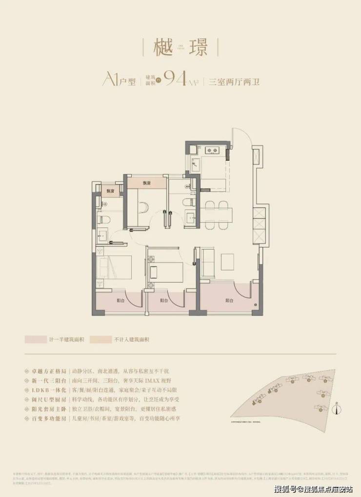 大华望樾建面约94㎡高层户型居然做到了三阳台的配置,远远超过新规标准。