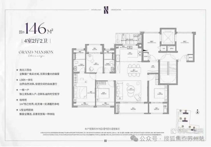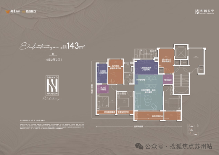 建面约143㎡的4房户型,类一梯一户的设计,每一户都有一个面积约8㎡的独立采光电梯厅空间;四开间朝南+大宽厅,采光效果爆棚;通过LDKB一体化设计,形成一个近50㎡的客餐厅空间,极大提升空间场景的可能性;卧室也采用了酒店化套房设计,主卧贯穿南北套房设计,南北皆有飘窗。