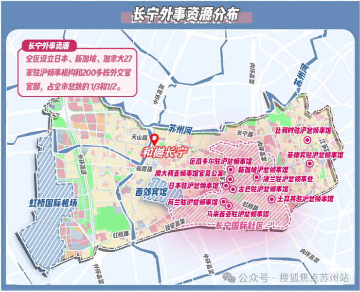 “外事客厅”的独一份定位,离不开长宁独一份的国际交通枢纽优势。作为全上海仅有与虹桥机场、高铁站“双枢纽”直接接壤的城区,其核心区域通过轨道交通、快速路网构建起“15分钟国际通勤圈”。