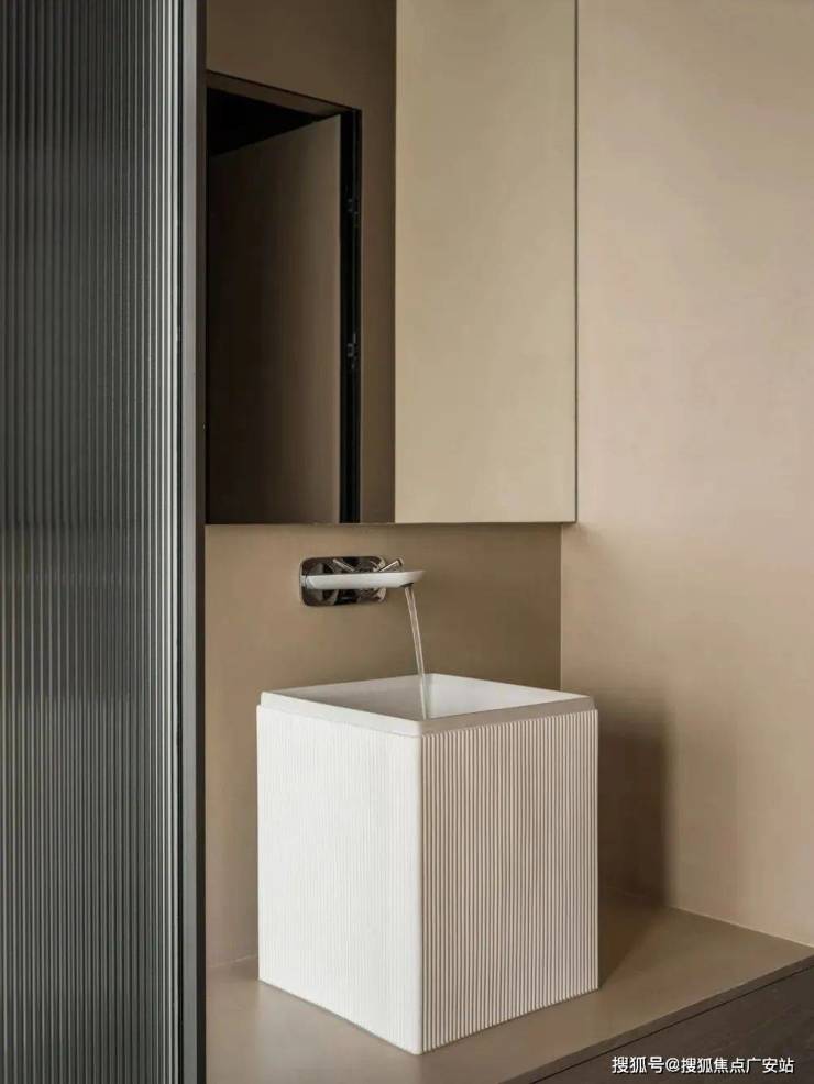 近活动室一侧安装洗手池,上方定制满墙浴室镜,增加视野明亮度,单人台盆有颜值且方便使用,左手边为原洗手间区域,让渡一部分空间给走道后,打造为马桶及淋浴区,实现干湿分离,功能齐全且合理利用空间。
