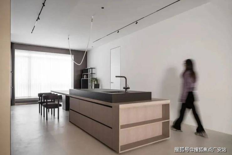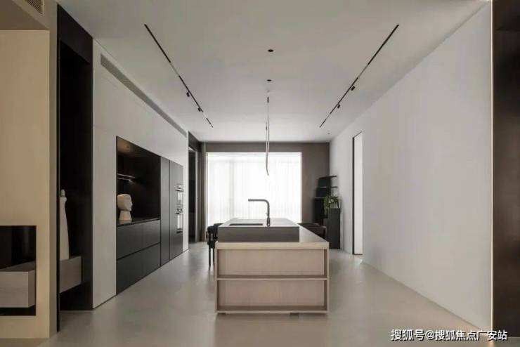 背景墙定制通高墙柜,上方预留吊顶空间,安装新风系统及中央空调,与整体墙柜视觉融合,更显简洁规整。下方定制操作台,作为西厨使用,近餐厅动线更符合屋主家人日常使用习惯,与内部中厨各自独立,便于分类收纳整理,及打扫卫生。