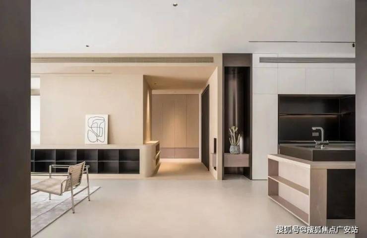 玄关与客厅之间采用不同色调微水泥,以视觉划分区域,形成空间感,同时于玄关处吊顶,藏起空调及各类管道,不影响客餐厅等高频率活动区域的层高视野,隐形加长出风口延伸至与墙面同宽,同吊顶融合一体,降低视觉存在感,更显简练。