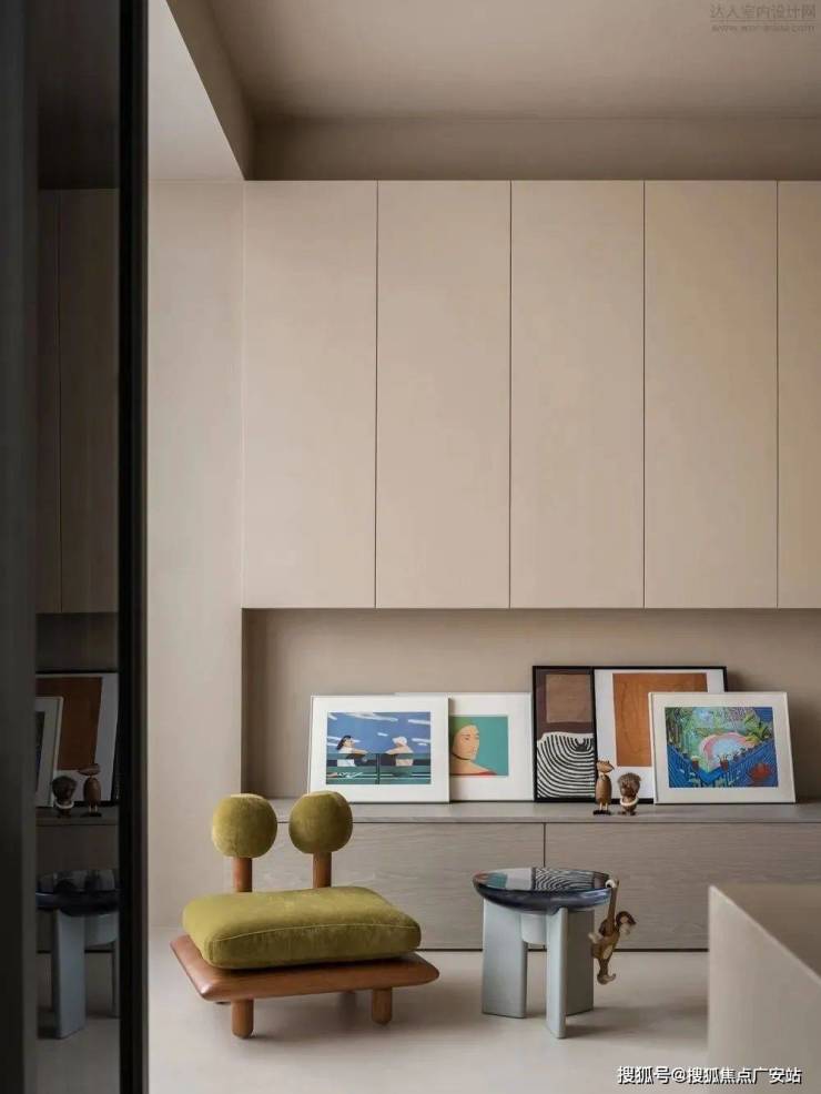 将原次卧打开,改造为儿童活动区,同时也形成连通动线,连接起玄关与客厅,让日常行动更为灵活,这里也作为保姆的休息室。玄关到活动室这条路上,右手边靠墙定制满墙通高柜,