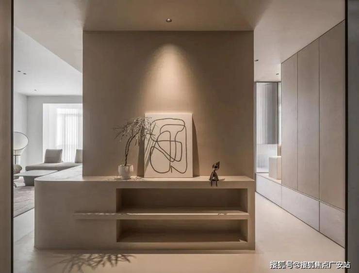 利用现有承重墙结构进行修饰,定制玄关端景,并转角延伸与客厅背景墙相连,增添空间互动性。定制壁龛式端景台,顶面暗装射灯洗墙增添氛围感。植株、艺术画、精致手办……让入户视野更精巧美观。