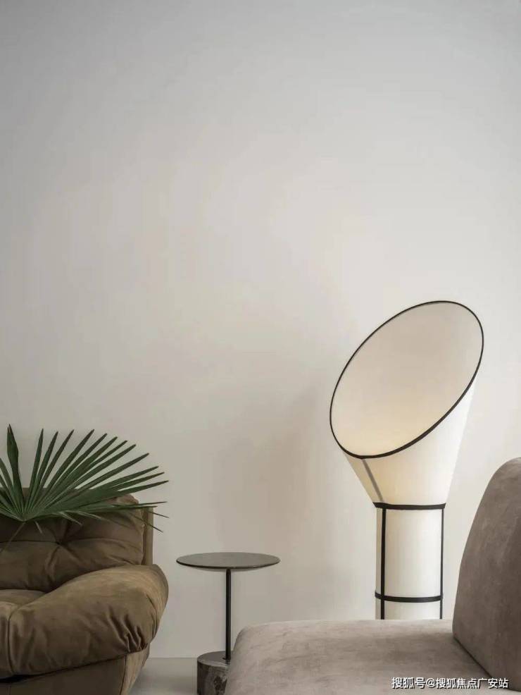 角落备上一方大理石座不锈钢小圆几,作为补充置物使用,实用且美观。极简后现代喇叭落地灯,造型简洁大方,赋予空间时尚的趣味感。