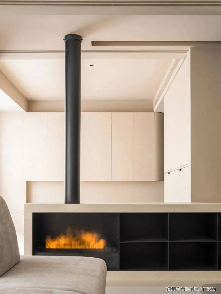 另一侧,于玻璃折叠门相交处定制壁炉,下方与柜体定制一体,视觉效果更显简洁,上方定制安装不锈钢烟管,方便壁炉正常使用,也能起到丰富空间层次的作用,不影响区域交互性的同时,为空间增添氛围感与仪式感。