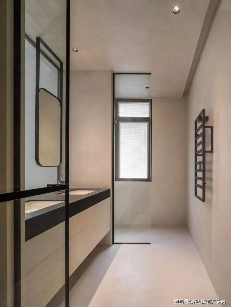 洗手池背景墙的磨砂玻璃、淋浴间的半墙玻璃隔断,都能在最大限度上给予空间光线,视觉上更加明亮宽敞,提升使用感。