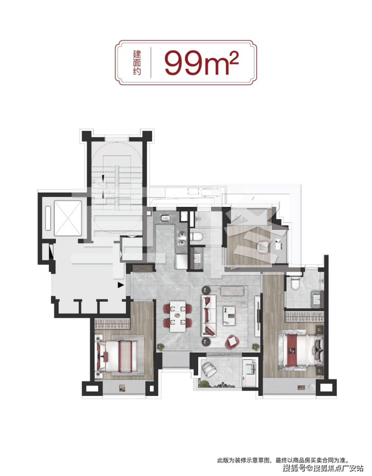 约99㎡3房2卫户型是上海市场中最主流的面积段之一,但印象青城的户型设计却超脱以往。