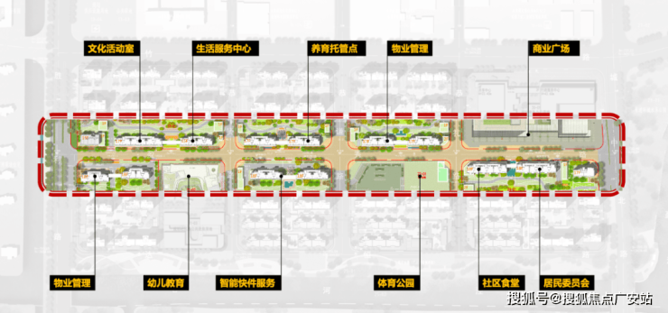 一轴:幼儿园、体育公园、快递驿站、文化活动空间等;