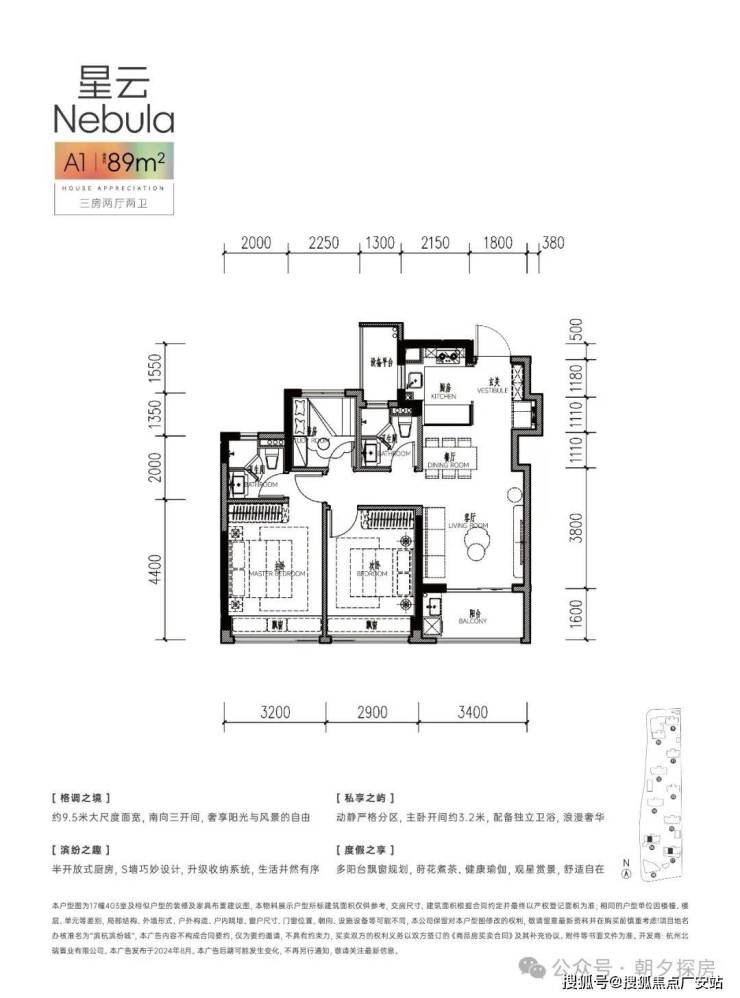 主力户型:89㎡3房2厅1卫、98㎡3房2厅2卫、112㎡4房2厅2卫,全屋配置方太厨电、科勒卫浴等品牌精装,层高3米47;