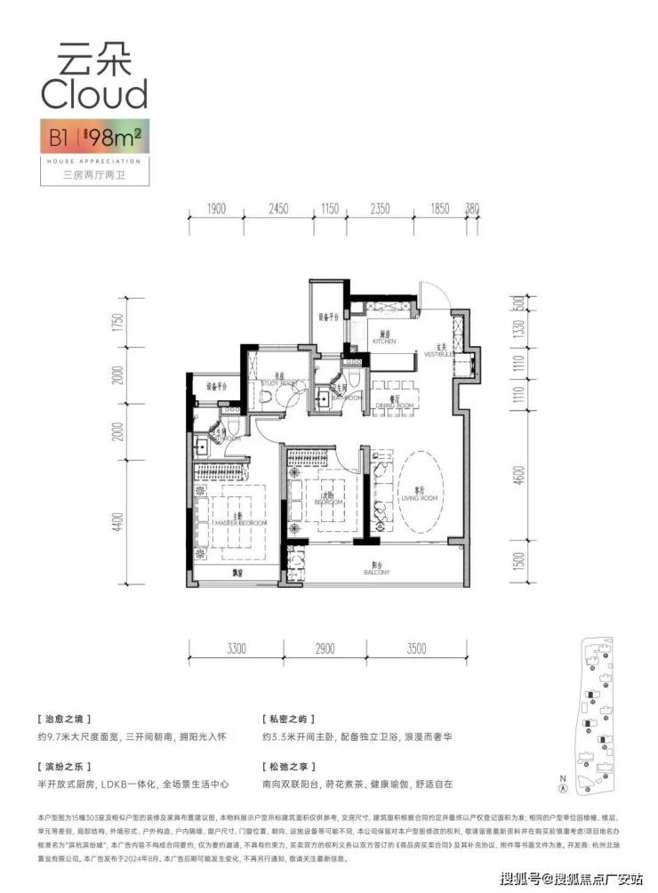 位于杭州临平区东湖新城核心区,荷禹路与康信路交叉口,由滨江集团开发,为地铁9号线兴元路站(在建)与康信路站(在建)双轨TOD综合体,占地约8.5万㎡,容积率2.5,规划1346户高层住宅,涵盖建面约89-112㎡精装户型,