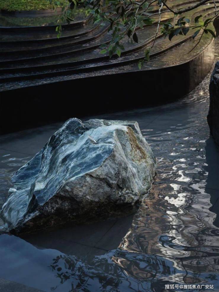 门庭前约29m对称式迎宾水轴,约7m直径落客水盘,水盘底部为“五绝”之巴西银河金奢石[流金银河],以水刀一圈圈切割行纹,形成层层叠水效果,呈现出“金石为开”的视觉奇观。