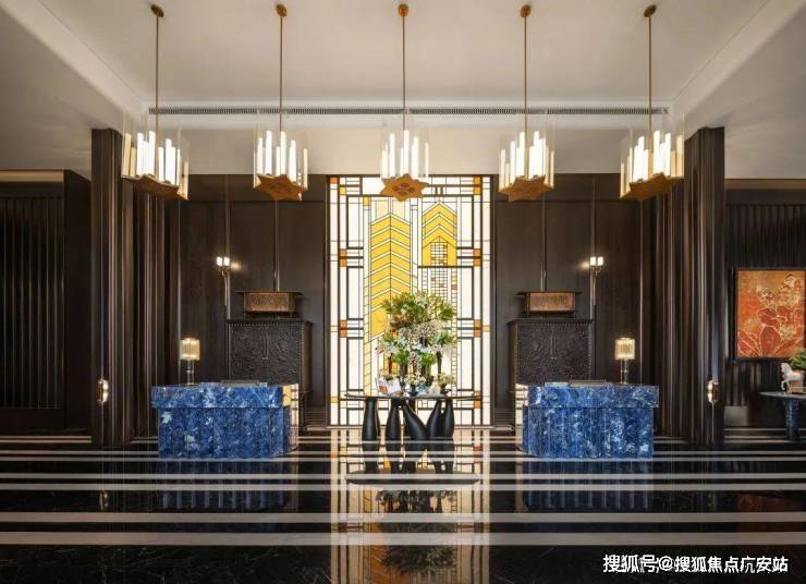 细节之处,光是一个接待台,就采用了产自玻利维亚约4500米海拔的高原矿脉——玻利维亚蓝石材,是世界上储存量最少的石材之一,非常珍贵;而大堂的柱子,也是巴西乌金奢石;
