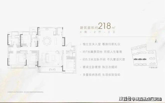 建面约218㎡户型:4室2厅3卫的顶配设计,拥有独立家政间和双套房设计,客厅与餐厅形成LDK一体化空间,连接约8米宽景观阳台,主卧配备独立衣帽间和豪华主卫