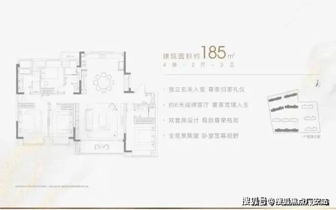 建面约185㎡户型:4室2厅3卫配置,增加一个多功能房间,可作为书房或儿童房,主卧空间更为宽敞,配备双台盆主卫和独立浴缸,客厅面宽达6米,采光极佳