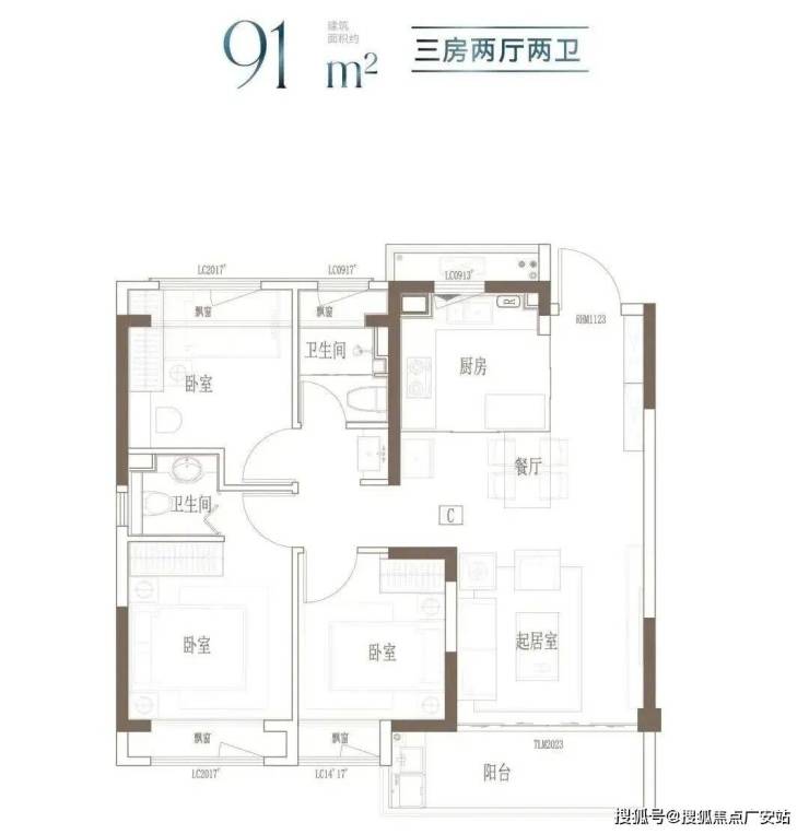 建面约91㎡-121㎡ 3房2厅2卫;这几个户型都是3房的设计,满足想一步到位的购房者。3开间朝南+客餐厅连通阳台+全卧室飘窗,以及套房式主卧设计+2卫,即使是三代同堂,也能让生活从容。