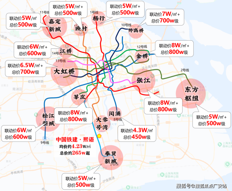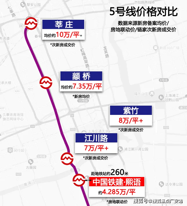 项目往北一站地铁,去年华润置地拿下的闵行江川路地块,房地联动价高达约5.8万/平;向北三站,颛桥新房均价高达约7.35元/平。