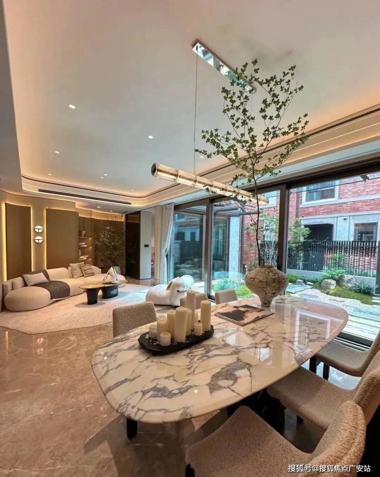 「无界空间」:客厅270度转角无柱设计,搭配落地玻璃,开阔视野将院中风景迎入日常。