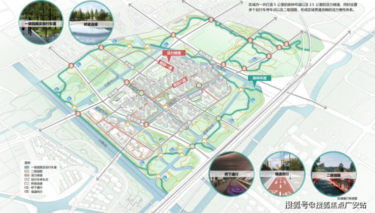 5公里森林环道以及3.5公里活力绿道,部分街区通过桥梁进行衔接,联系被市政道路割裂的绿地,使绿地成为一个整体,车流量大的城市道路交叉处慢行系统桥下通过。