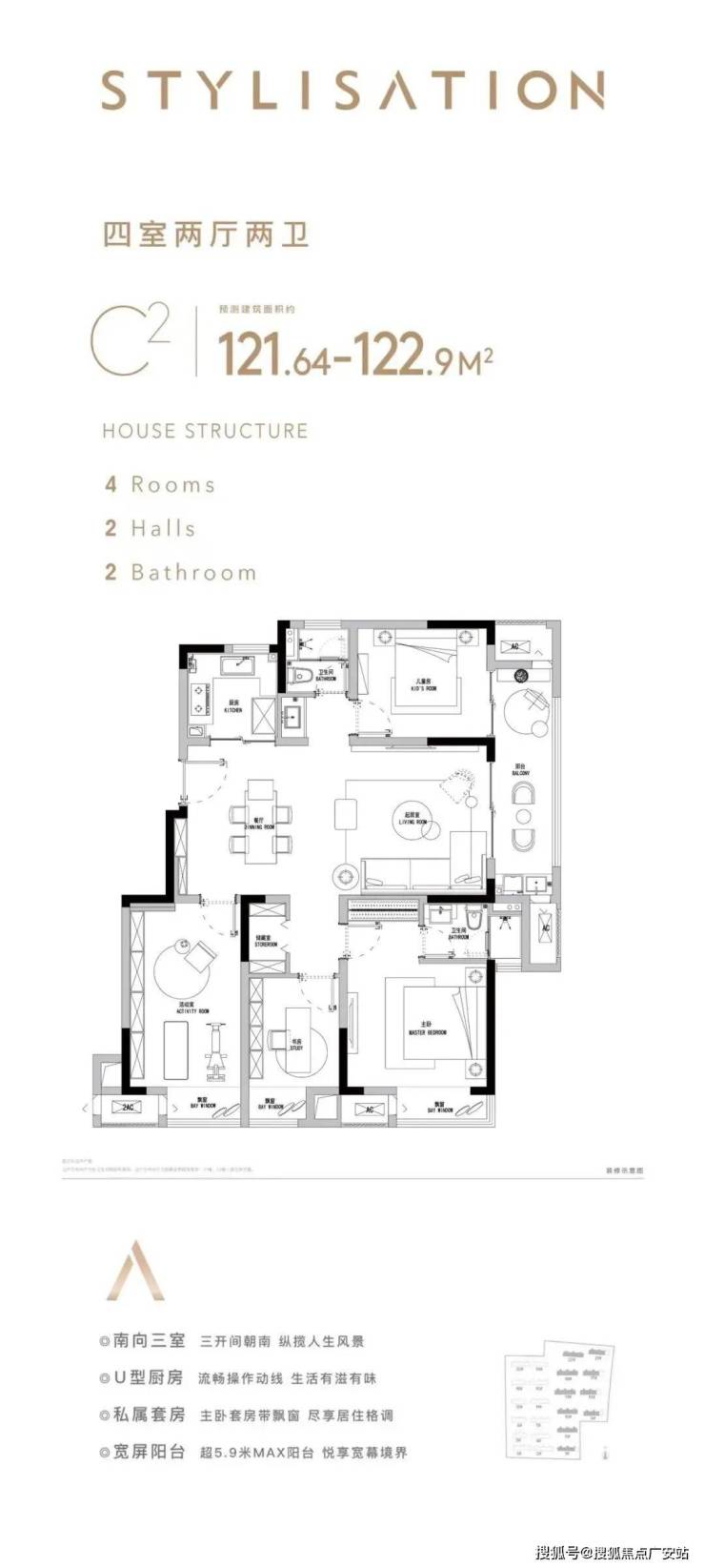 ④双联阳台 功能室界:建面约75-120㎡功能户型,均双阳台设计,营造沉浸式生活体验。多飘窗、南向开间