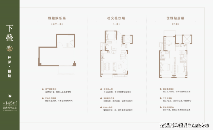 以145㎡下叠为例,四房两厅三卫全能格局,非常适合二娃家庭以及三代同堂。