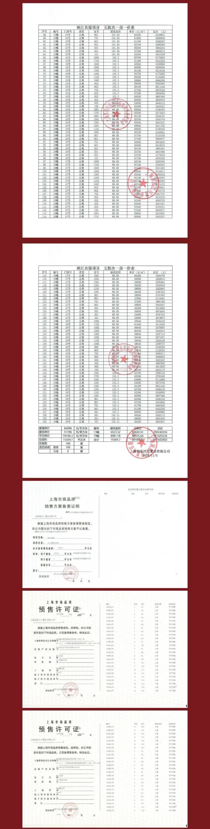 本资料为要约邀请,不作为要约或承诺,项目具体信息以政府最终审批文件为准;项目周围环境、交通及其他公共设施的效果示意以实际落成或政府部门标准文件为准。有关学区划分根据政府部门当年的划分为准,不作为开发商的任何承诺。相关宣传内容不排除因政府规划、规定及分期规划、未能控制等原因发生变化,在不违反法律法规、合同约定前提下,本公司有权对该宣传资料细节进行调整或更新。预售证号:闵行房管(2024)预字0000120号、闵行房管(2024)预字0000164号、闵行房管(2024)预字0000232号、闵行房管(2024)预字0000269号、闵行房管(2024)预字0000351号。制作日期: 2024年11月19日。开发商:上海润泓江川置业有限公司;备案名: 映江名邸 ;营销推广名:映江润府
