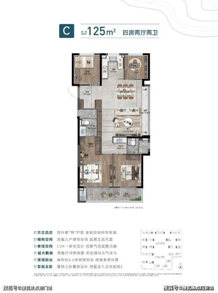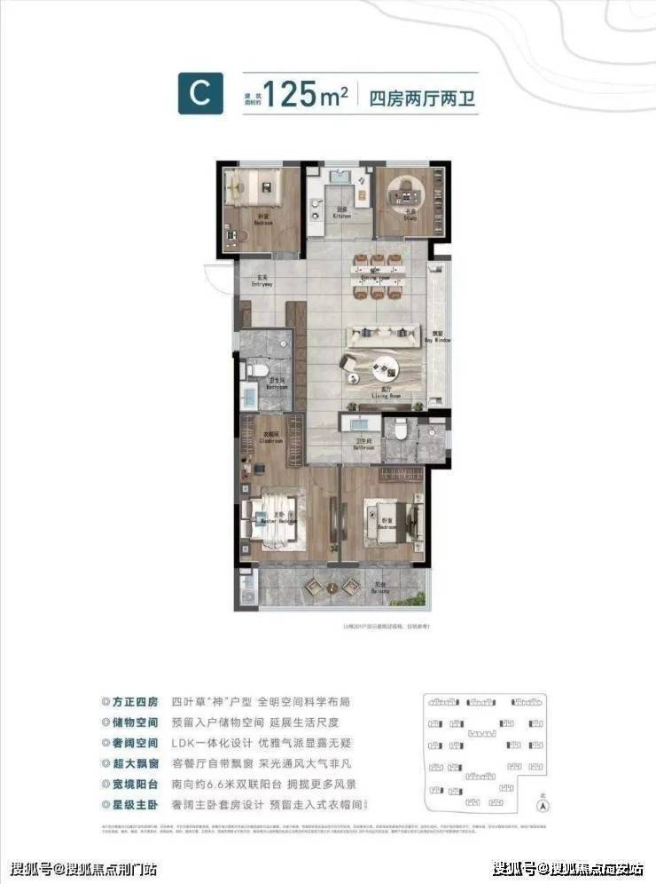 在空间的设计上,阅尚境均以阔绰的尺度考量,为新一代改善家庭量身定制从容悠享的非凡空间。125㎡“四叶草”全能四房为四房两厅两卫边套设计,客餐厅一体配备了大面宽、大视野飘窗;南向双卧室,设置了一体双阳台;入户同样带有隐藏式储物柜,预留客餐厅长柜空间,客卫干湿分离。