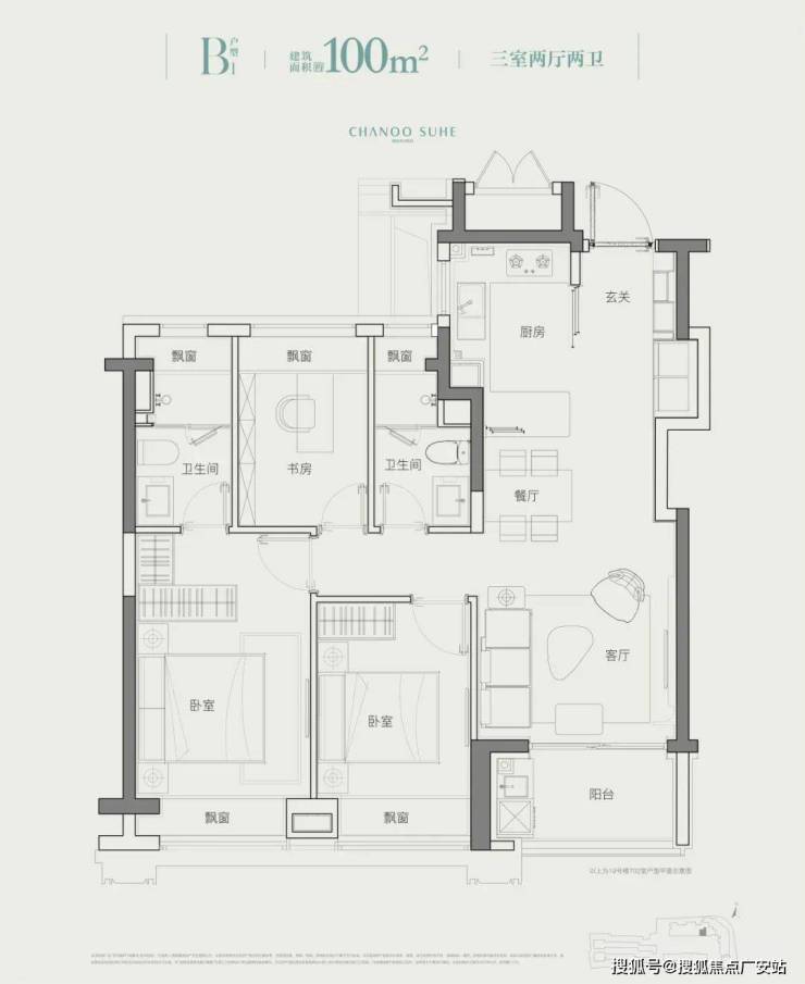 A户型为东边套,仅22套。三面宽朝南,全明双卫,设有实用的S型收纳玄关和U型厨房,主卧设有270°转角大飘窗,极致采光和景观视野。
