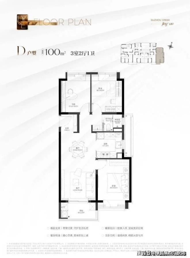 建筑面积约100㎡3房D户型:南北通透的设计让该户型拥有更加优秀的通风效果.而且这个户型做到了全卧飘窗(3个飘窗)+南向瞰景大阳台,丰富的灵动空间提升了实得面积!