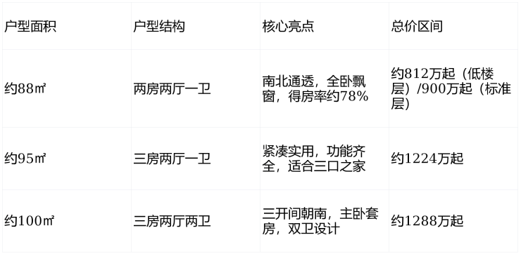 主力户型:约88㎡两房、约100㎡三房,总价约812万起、1288万起,为刚需/初改主力